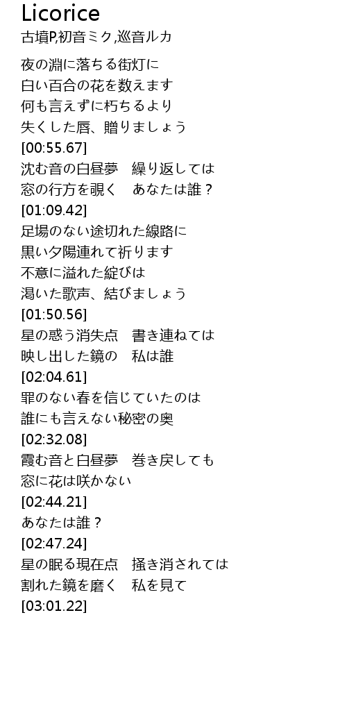 | [01:02.92] | 窓の行方を覗く あなたは誰? |