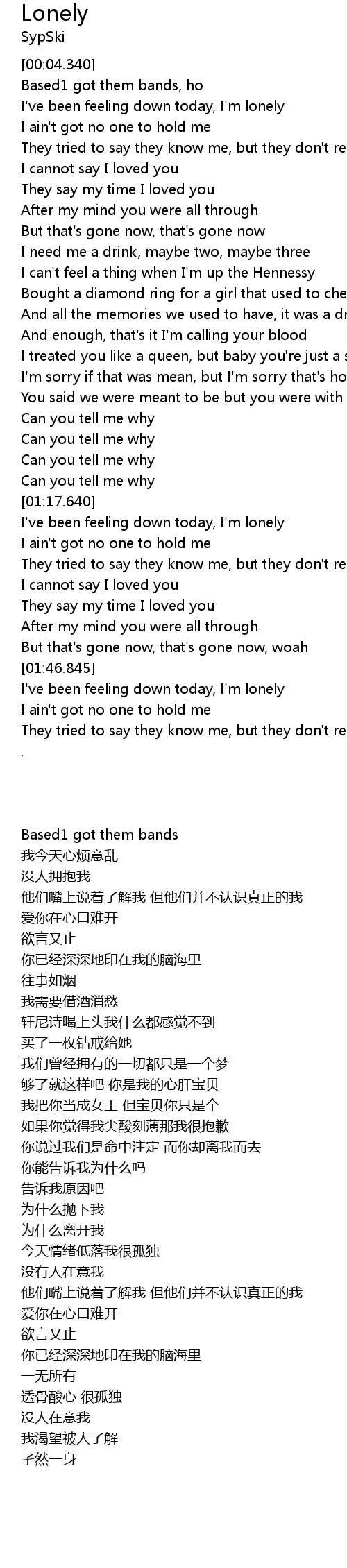 | [01:54.525] | I've been feeling down today, I'm lonely |