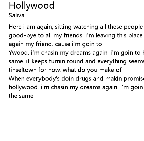 When everybody's doin drugs and makin promises like this. cause i'm goin to hollywood. i'm chasin my dreams again. i'm goin to hollywood, and i'll never be the same. |