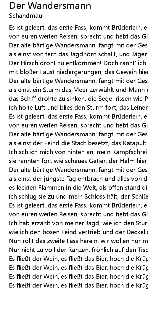 | Es flie t der Wein, es flie t das Bier, hoch die Krü ge, trinken wir! |