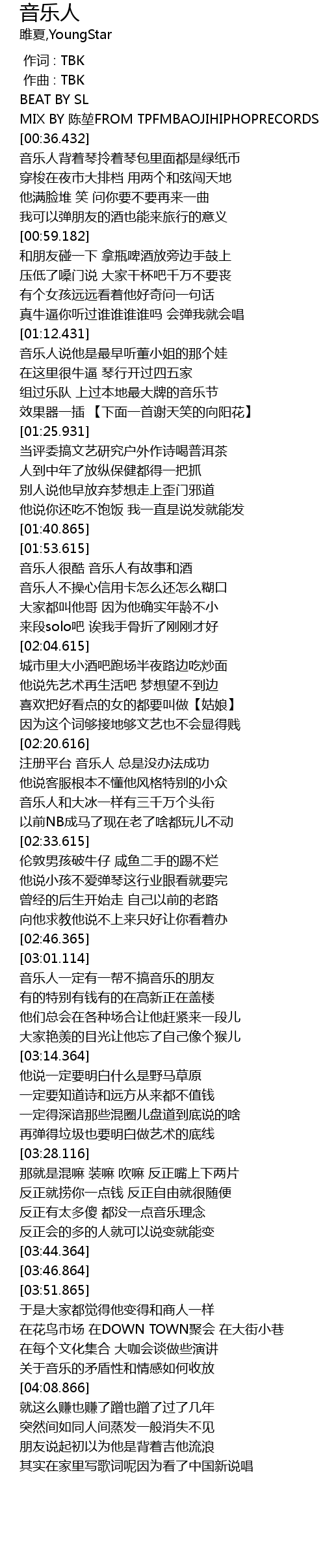 | [01:56.864] | yīn yuè rén bù cāo xīn xìn yòng kǎ zěn me hái zěn me hú kǒu |