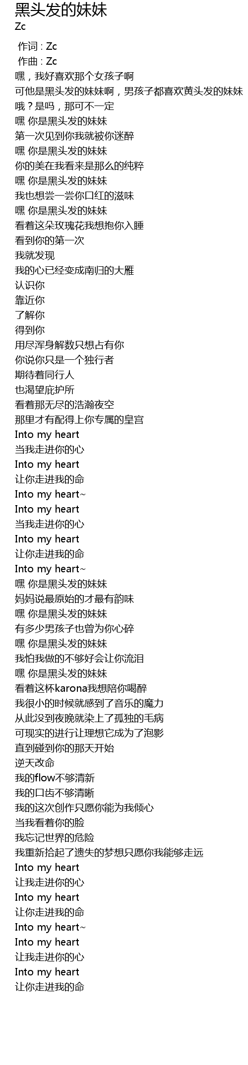 | [01:38.717] | hēi nǐ shì hēi tóu fà de mèi mei |