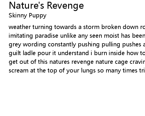 | weather turning towards a storm broken down road continue on coexistance imitating paradise unlike any seen moist has been dancing crazy overcast ash grey wording constantly pushing pulling pushes away drew back a rusty knife guilt ladle pour it understand i burn inside how to get out of here how do you get out of this natures revenge nature cage craving wonder the worth of it scream at the top of your lungs so many times tried not to wonder |