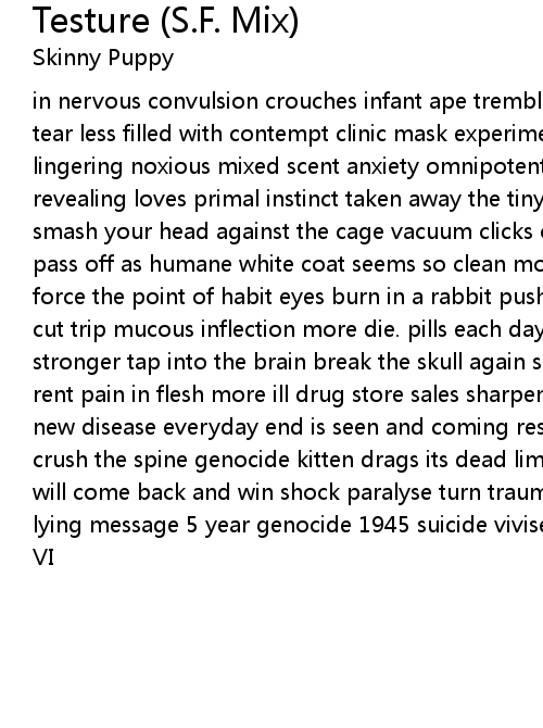 in nervous convulsion crouches infant ape trembling in mothers shit cage eyes tear less filled with contempt clinic mask experiment with life and death smell lingering noxious mixed scent anxiety omnipotent doctor grinds the cage door revealing loves primal instinct taken away the tiny face terrified rant and rave smash your head against the cage vacuum clicks on high conscious of the pain pass off as humane white coat seems so clean most dirt bleached out of greed force the point of habit eyes burn in a rabbit push the pain test button spines cut trip mucous inflection more die. pills each day what goes around comes back stronger tap into the brain break the skull again smash price research rat lab rent pain in flesh more ill drug store sales sharpen the knife emphasis on money new disease everyday end is seen and coming reseach turns it's back to gain crush the spine genocide kitten drags its dead limb continuing all suffering it will come back and win shock paralyse turn trauma burns out the will to live the lying message 5 year genocide 1945 suicide vivisect |