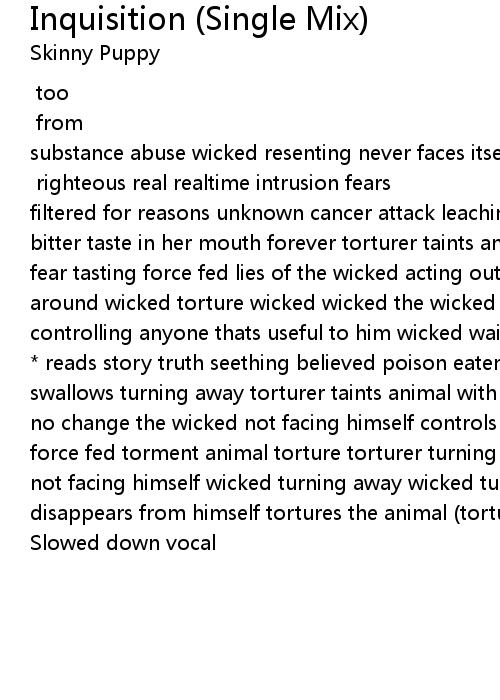 blatant manner speak parting bonding cement no longer holds parting [lips?] too young to grow old addicted romance love tested [feeling?/ailing?/healing?] from substance abuse wicked resenting never faces itself torturer taints animal waits no evironment torturer loving [???*] righteous real realtime intrusion fears filtered for reasons unknown cancer attack leaching desserts so sweet leaves bitter taste in her mouth forever torturer taints animal waits corners creeping fear tasting force fed lies of the wicked acting out fears false truths turned around wicked torture wicked wicked the wicked words of the torturer abusing and controlling anyone thats useful to him wicked waiting of the torturer wicked waits the torturer [???]* reads story truth seething believed poison eaten swallows turning away torturer taints animal with hate enlightenment turned away no change the wicked not facing himself controls turning away wicked torturer force fed torment animal torture torturer turning away wicked torturer wicked not facing himself wicked turning away wicked turning away turning away disappears from himself tortures the animal (tortures the animal) * |