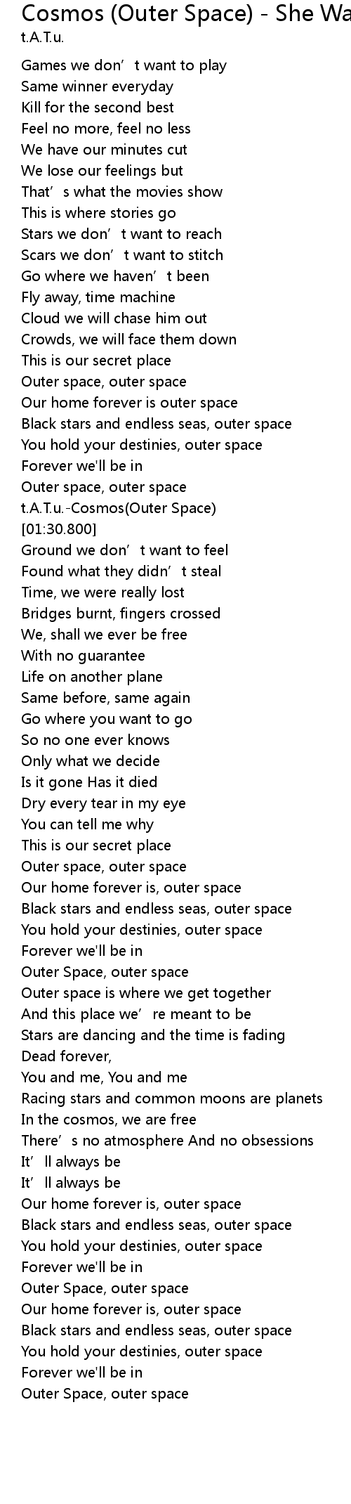 | [01:28.140] | t.A.T.u.-Cosmos(Outer Space) |