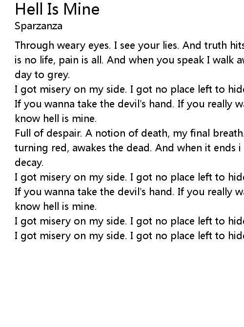 I got misery on my side. I got no place left to hide. Once again, hell is mine. If you wanna take the devil's hand. If you really wanna understand. You have to know hell is mine. |