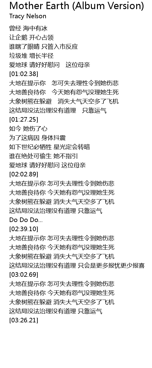 | [00:51.50] | 爱地球 请好好慰问 这位母亲 |