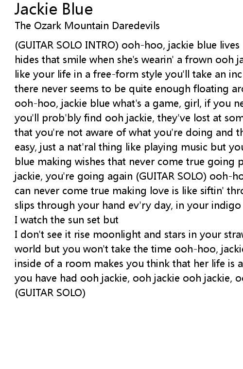 (GUITAR SOLO INTRO) ooh-hoo, jackie blue lives her life from inside of a room hides that smile when she's wearin' a frown ooh jackie, you're not so down you like your life in a free-form style you'll take an inch but you'd love a mile there never seems to be quite enough floating around to fill your lovin' cup ooh-hoo, jackie blue what's a game, girl, if you never lose ask a winner and you'll prob'bly find ooh jackie, they've lost at sometime don't try to tell me that you're not aware of what you're doing and that you don't care you say it's easy, just a nat'ral thing like playing music but you never sing ooh-hoo, jackie blue making wishes that never come true going places where you've never been ooh jackie, you're going again (GUITAR SOLO) ooh-hoo, jackie blue likes a dream that can never come true making love is like siftin' through sand ooh jackie, it slips through your hand ev'ry day, in your indigo eyes