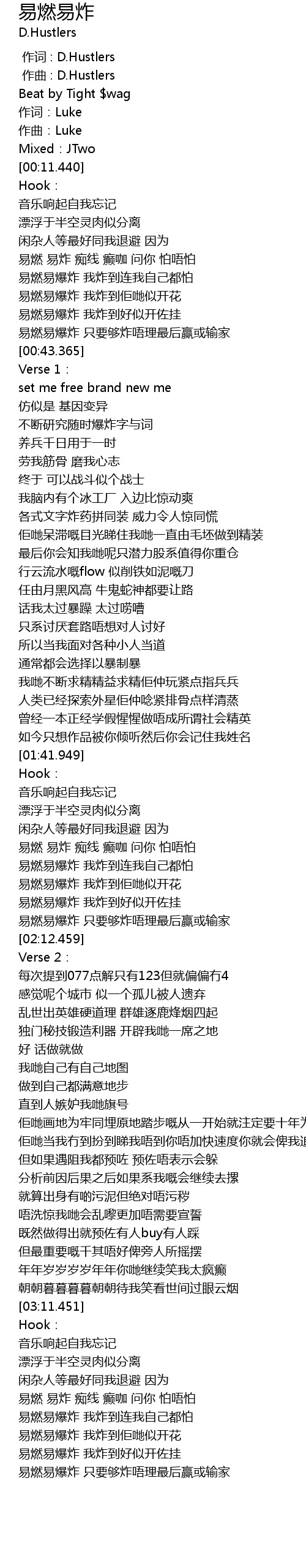 | [01:55.699] | 易燃 易炸 痴线 癫咖 问你 怕唔怕 |