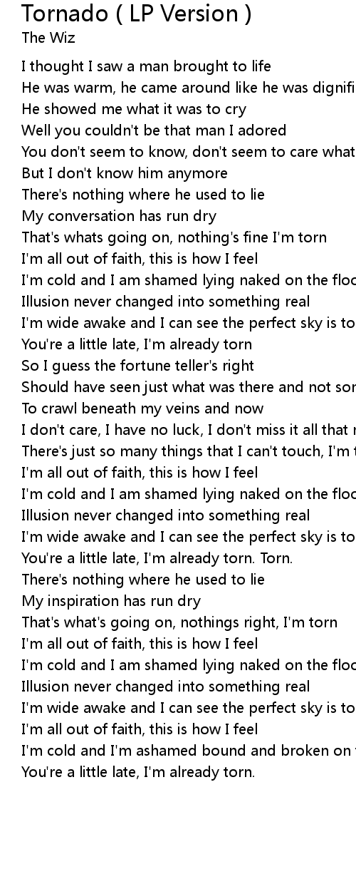 | [00:46.00] | That's whats going on, nothing's fine I'm torn |