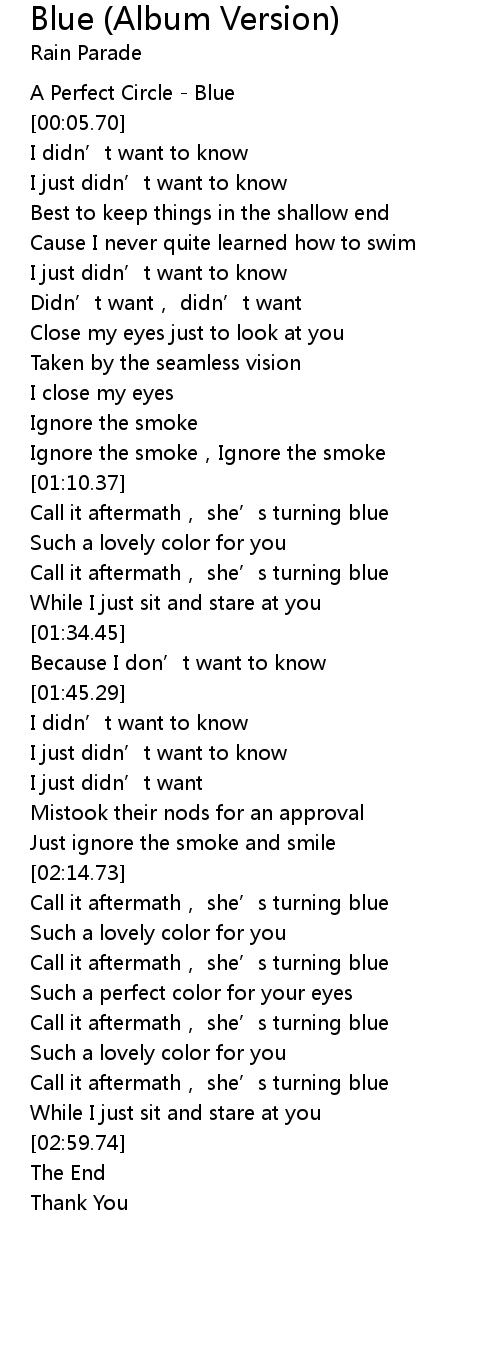 | [02:37.80] | Call it aftermath, she’s turning blue |