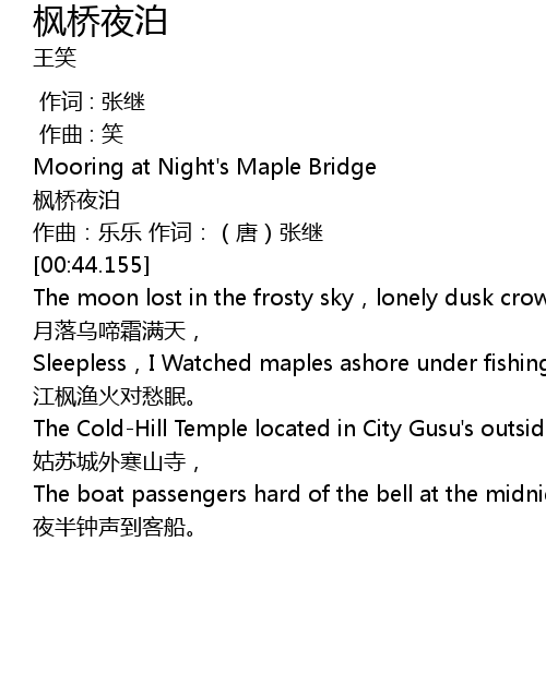 | [00:39.405] | 作曲:乐乐 作词:(唐)张继 |
