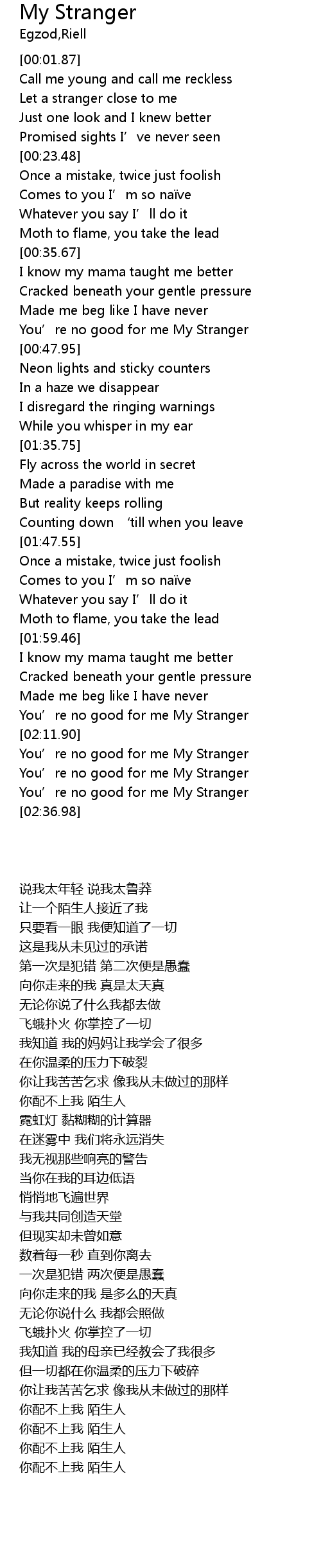 | [02:20.42] | You’re no good for me My Stranger |