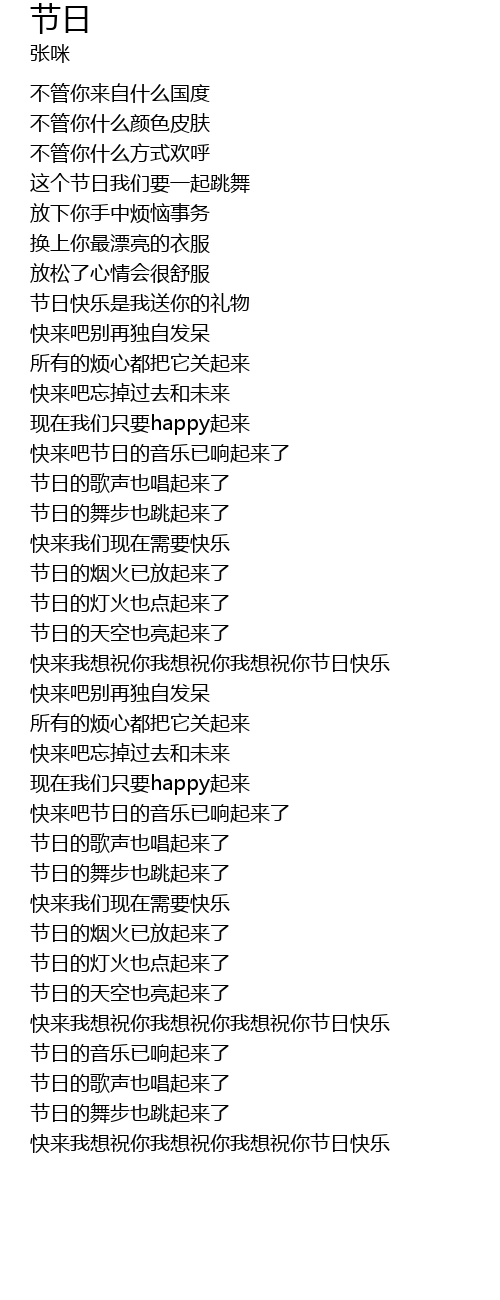 | [01:58.36] | kuài lái wǒ xiǎng zhù nǐ wǒ xiǎng zhù nǐ wǒ xiǎng zhù nǐ jié rì kuài lè |