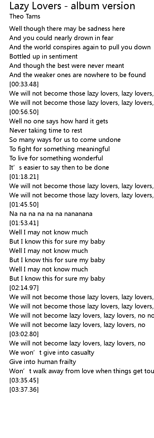 | [02:49.96] | We will not become lazy lovers, lazy lovers, no |