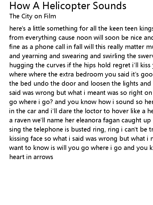 here's a little something for all the keen teen kings and queens: learn a lesson from everything cause noon will soon be nice and find the color of your eyes as fine as a phone call in fall will this really matter much at all? i'm learning and yearning and swearing and swirling the swerves make plans for the nerves i'm hugging the curves if the hips hold regret i'll kiss you on the lips when we get where where the extra bedroom you said it's good for the soul so let's unbutton the bed undo the door and loosen the lights and fall about the floor so what i said was wrong but what i meant was so right on what i want to know is will you go where i go? and you know how i sound so here's my heart in arrows sleep hard in the car and i'll dare the loctor to hover like a helicopter our baby will be a raven we'll name her eleanora fagan caught up on the cross streets stop and sing the telephone is busted ring, ring i can't be trusted up too late, too much kissing face so what i said was wrong but what i meant was so right on what i want to know is will you go where i go and you know how i sound so here's my heart in arrows |