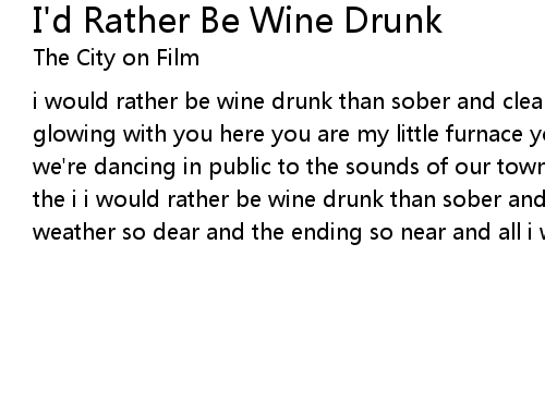 | i would rather be wine drunk than sober and clear under these streetlights and glowing with you here you are my little furnace you are my favorite song and we're dancing in public to the sounds of our town to the traffic rolling down the i i would rather be wine drunk than sober and clear when we're together in weather so dear and the ending so near and all i want is right here |