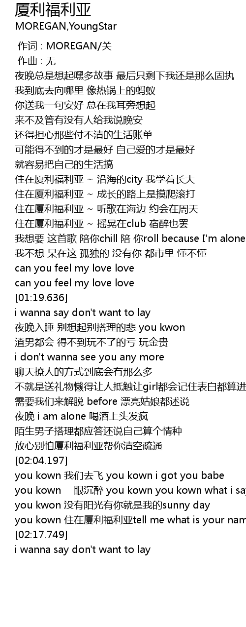 | [00:52.182] | 住在厦利福利亚 ~ 听歌在海边 约会在周天 |