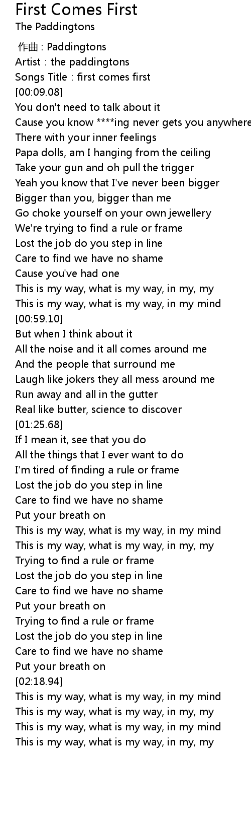 | [00:05.38] | Songs Title:first comes first |