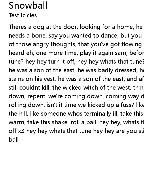 Theres a dog at the door, looking for a home, he needs a brand new wife, he needs a bone, say you wanted to dance, but you couldn't get out of bed, with all of those angry thoughts, that you've got flowing round your head. one of the heard eh, one more time, play it again sam, before we die. hey hey whats that tune? hey hey turn it off, hey hey whats that tune? hey hey are you still here? he was a son of the east, he was badly dressed, he had a knot in his hand, and stains on his vest. he was a son of the east, and after all he confessed, he still couldnt kill, the wicked witch of the west. think quick, duck right, slow down, repent. we're coming down, coming way down from up up above, hear it rolling down, isn't it time we kicked up a fuss? like a snow ball rolling down the hill, like someone whos terminally ill, take this disease its tasty and warm, take this shake, roll a ball. hey hey, whats that tune? hey hey turn it off x3 hey hey whats that tune hey hey are you still here snow ball throwing the ball |