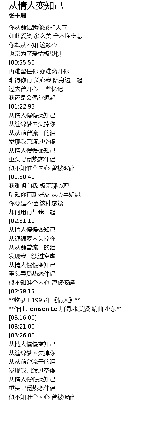 | [03:26.92] | cóng qíng rén màn màn biàn zhī jǐ |