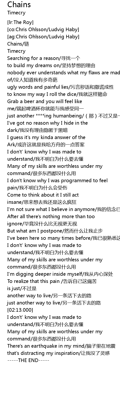 | [01:17.700] | I don' t know why I was programmed to feel pain wǒ bù míng bái wèi shí me huì shòu shāng |