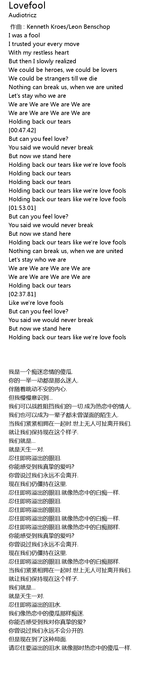 | [02:05.01] | Holding back our tears like we' re love fools |