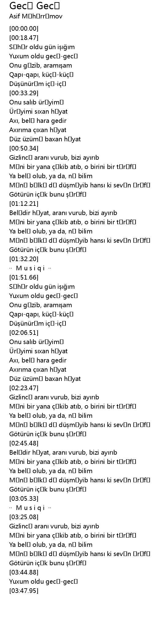 | [02:37.53] | Mənə bəlkə də düşməyib hansı ki sevən ərəfə |