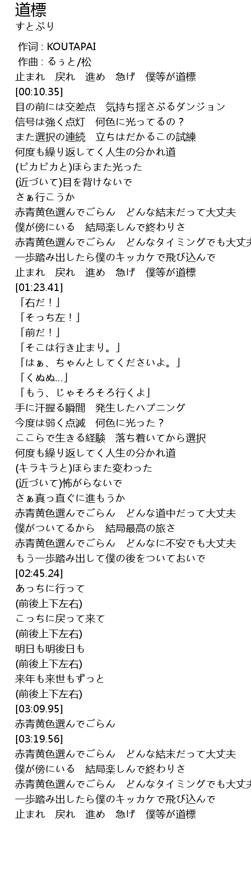 | [01:18.05] | 止まれ 戻れ 進め 急げ 僕等が道標 |