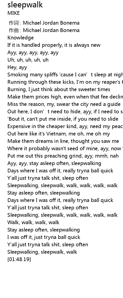 | [01:44.29] | Sleepwalking, sleepwalk, walk |