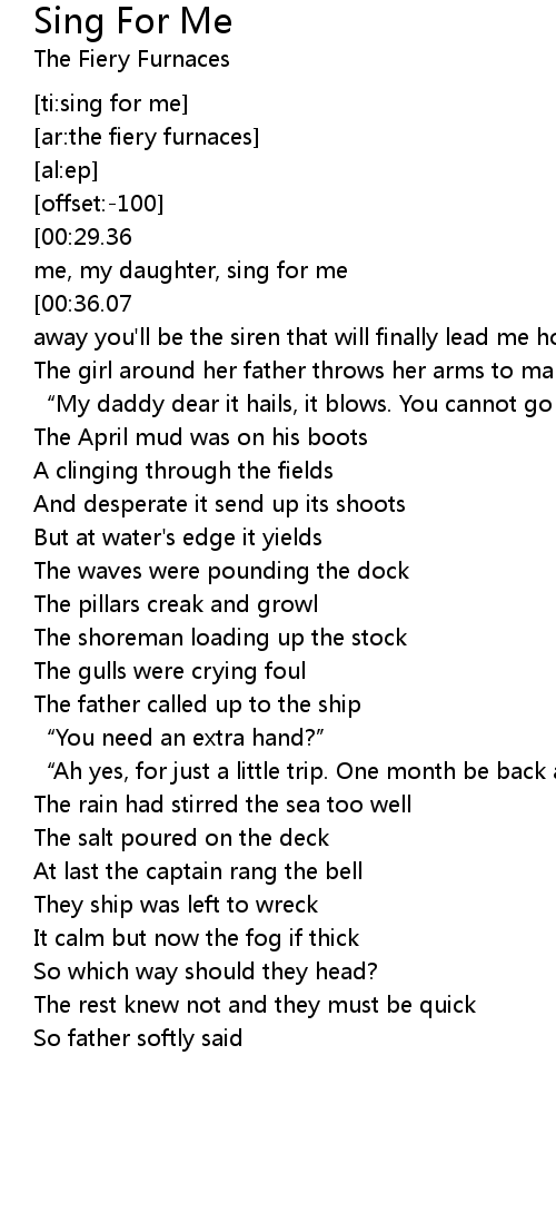 | [00:00.56][00:29.36][00:58.89][01:27.52][02:34.86][03:03.88][03:18.39] | Sing for me, my daughter, sing for me |