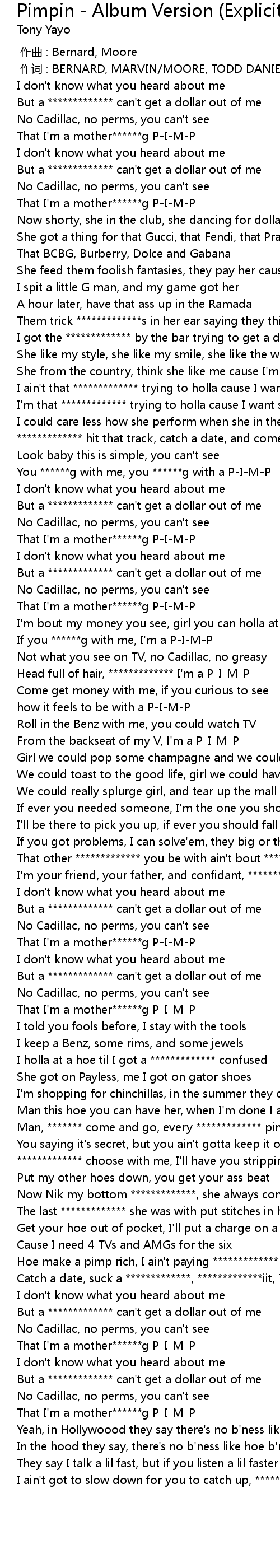 | [00:22.50] | That I'm a mother******g P-I-M-P |