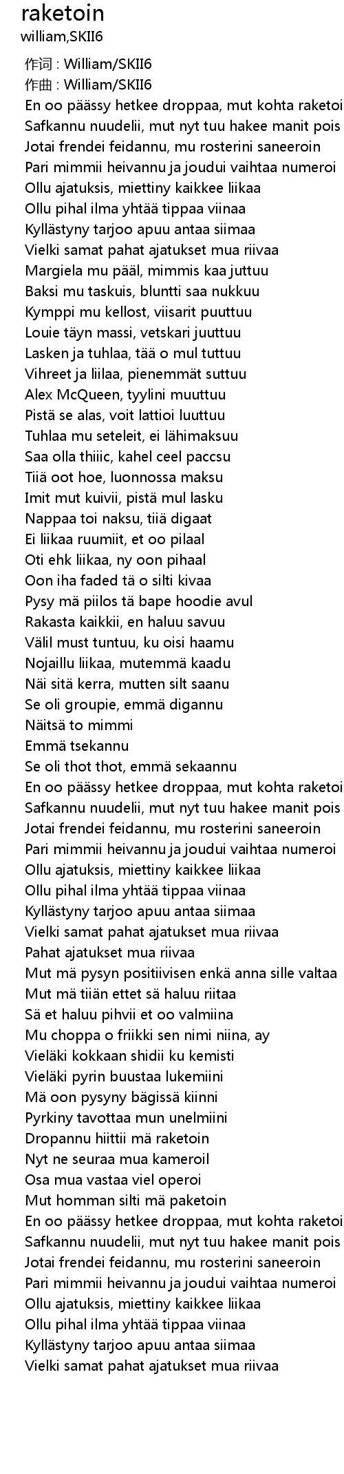| [00:13.729] | En oo p ssy hetkee droppaa, mut kohta raketoin |