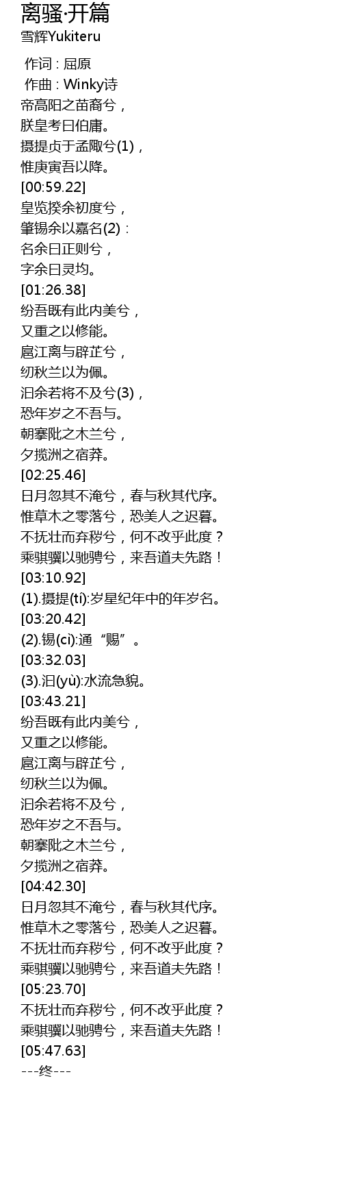 | [00:46.79] | 摄提贞于孟陬兮(1), |