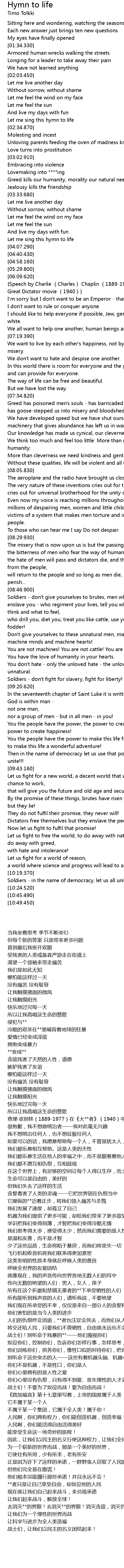 | [06:44.490] | Speech by Charlie Charles Chaplin 18891977 from The Great Dictator movie 1940 |