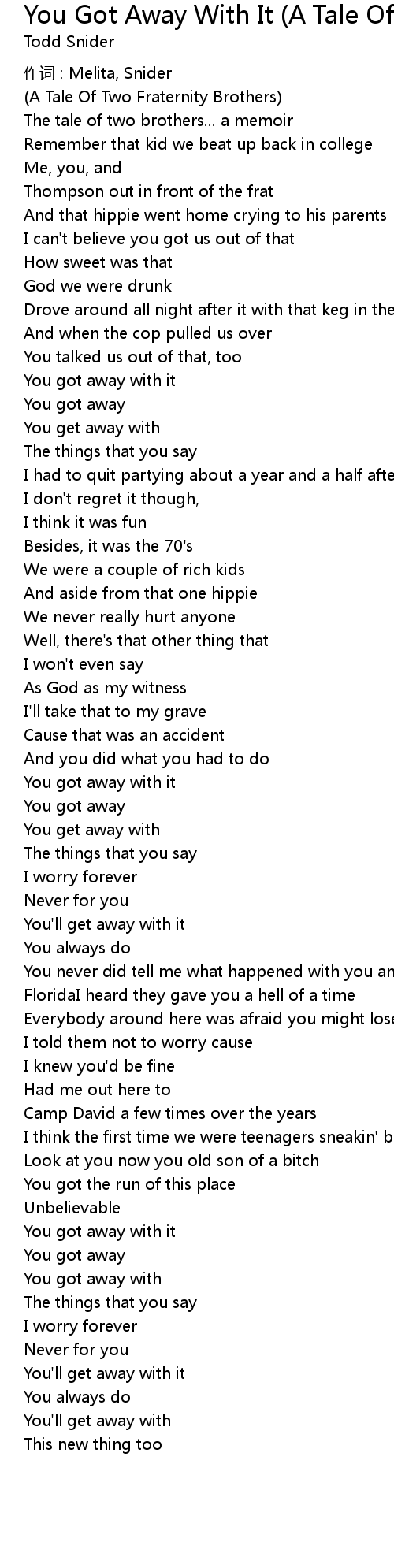 | Song | You Got Away With It (A Tale Of Two Fraternity Brothers) |