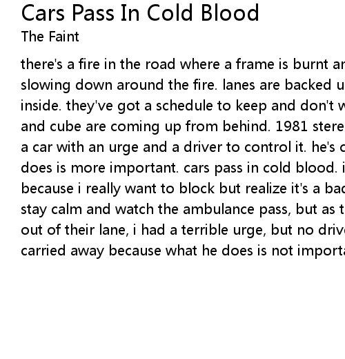 there's a fire in the road where a frame is burnt and other automobiles are slowing down around the fire. lanes are backed up and people get all anxious inside. they've got a schedule to keep and don't want life to slip by. the siren and cube are coming up from behind. 1981 stereo is drowned from the sound. i see a car with an urge and a driver to control it. he's carried away because what he does is more important. cars pass in cold blood. i hold back, it's hard to; because i really want to block but realize it's a bad time for that. i try to stay calm and watch the ambulance pass, but as the car with the schedule pulled out of their lane, i had a terrible urge, but no driver to control it. don't get carried away because what he does is not important. |