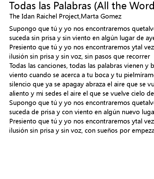 | Todas las canciones, todas las palabras vienen y bailancon el sonido que hace el viento cuando se acerca a tu boca y tu pielmi rame un instante, toca este silencio que ya se apagay abraza el aire que se vuelve cielo dentro de tu aliento y mi sedes el aire el que se vuelve cielo dentro de mi sed | |