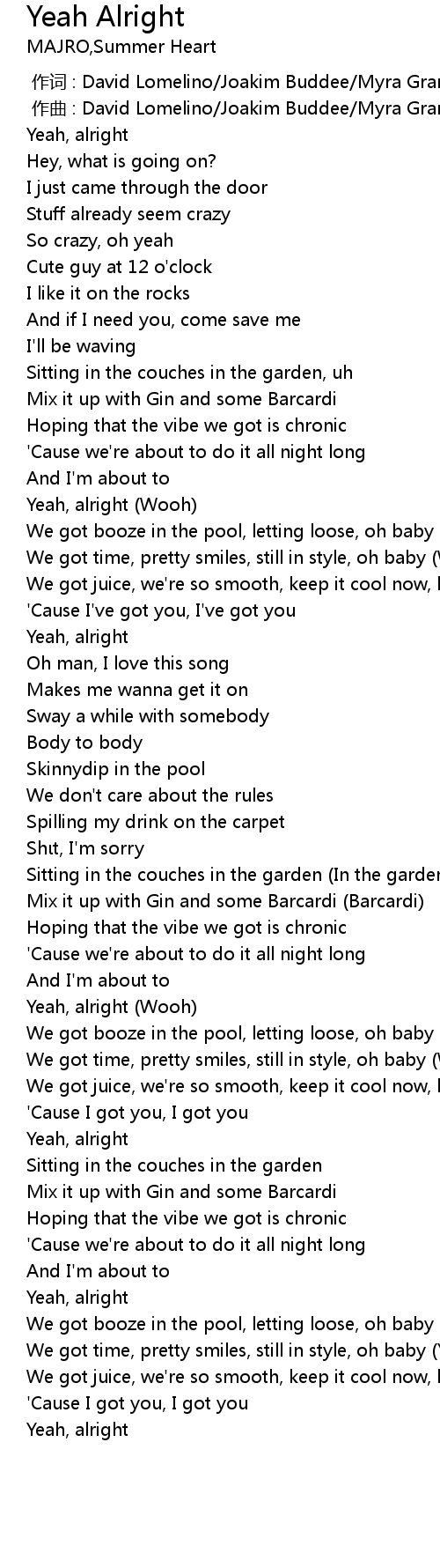 | [02:43.070] | We got booze in the pool, letting loose, oh baby (Yeah, alright) |