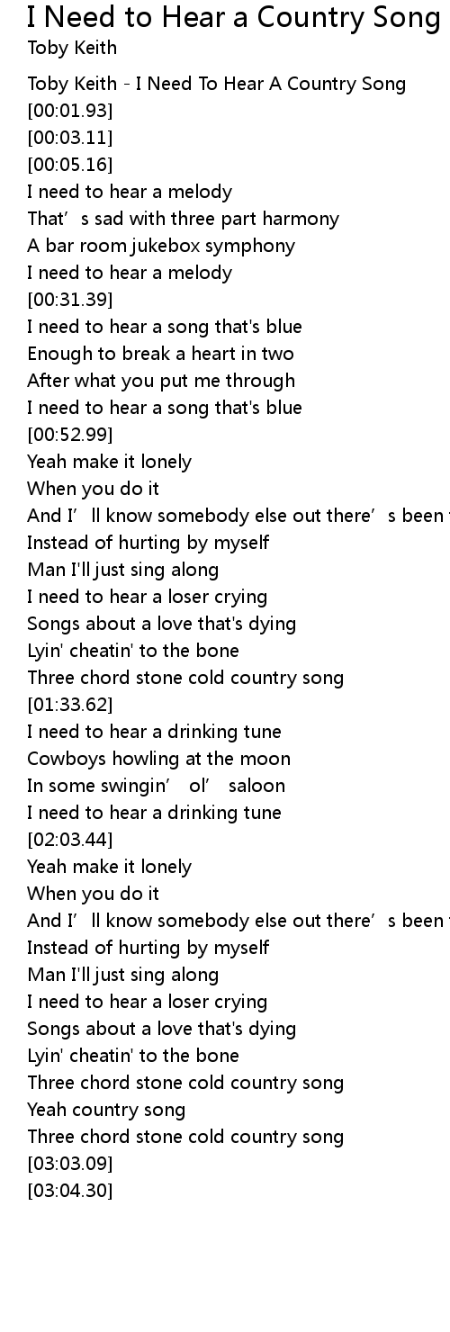 | [00:00.00] | Toby Keith - I Need To Hear A Country Song |