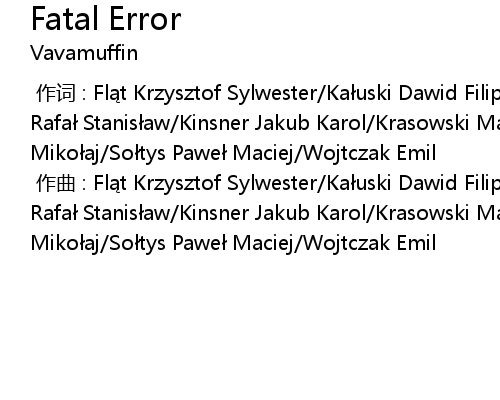 | [00:00.00-1] | 作曲 : Fląt Krzysztof Sylwester/Kałuski Dawid Filip/Kazanowski Rafał Stanisław/Kinsner Jakub Karol/Krasowski Marcin/Molak Aleksander Mikołaj/Sołtys Paweł Maciej/Wojtczak Emil |