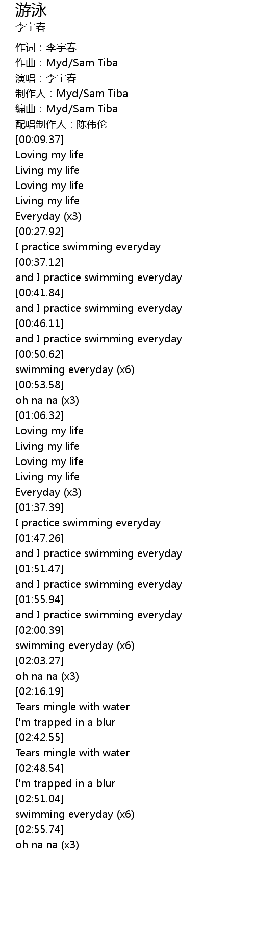 | [02:01.94] | swimming everyday (x6) |