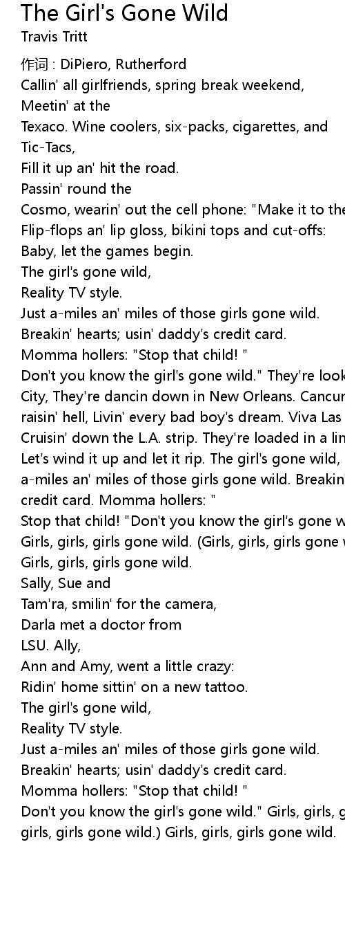 | Don' t you know the girl' s gone wild." Girls, girls, girls gone wild. Girls, girls, girls gone wild. Girls, girls, girls gone wild. |