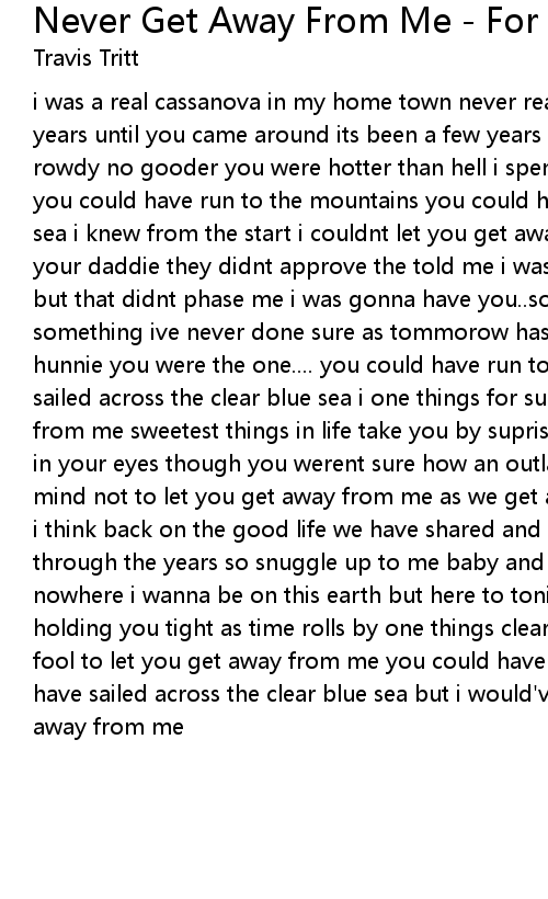 i was a real cassanova in my home town never really thought about settling down years until you came around its been a few years but i remember it well i was a rowdy no gooder you were hotter than hell i spent all my time hot on your trail you could have run to the mountains you could have sailed across the clear blue sea i knew from the start i couldnt let you get away from me well your momma and your daddie they didnt approve the told me i was trash and i was born to lose but that didnt phase me i was gonna have you..so i begged and ive pleaded something ive never done sure as tommorow has a rising sun there was no mistake hunnie you were the one.... you could have run to the mountains you could have sailed across the clear blue sea i one things for sure you would never get away from me sweetest things in life take you by suprise like the heaven i see lookin in your eyes though you werent sure how an outlaw love would be i made up my mind not to let you get away from me as we get a lil closer to our rockin chairs i think back on the good life we have shared and how our love has grown down through the years so snuggle up to me baby and turn out the lights there is nowhere i wanna be on this earth but here to tonite then lyin in your arms holding you tight as time rolls by one things clear to see i would've been a fool to let you get away from me you could have run to the mountains you could have sailed across the clear blue sea but i would've been a fool to let you get away from me |