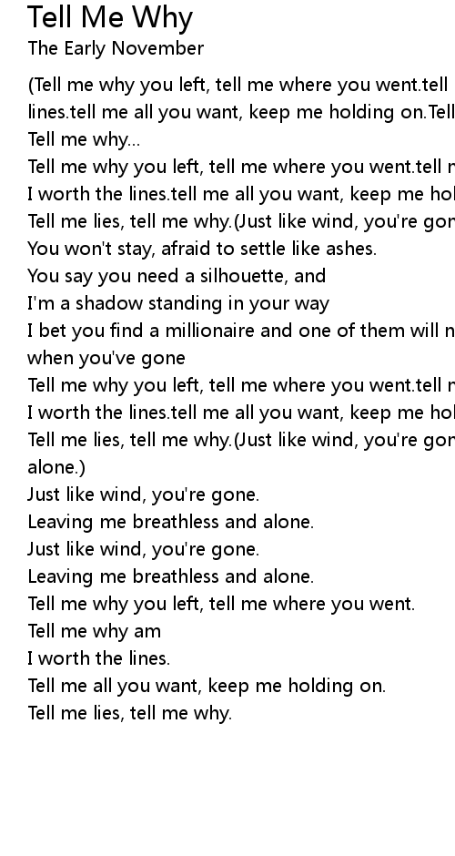 (Tell me why you left, tell me where you went.tell me why am I worth the lines.tell me all you want, keep me holding on.Tell me lies) |