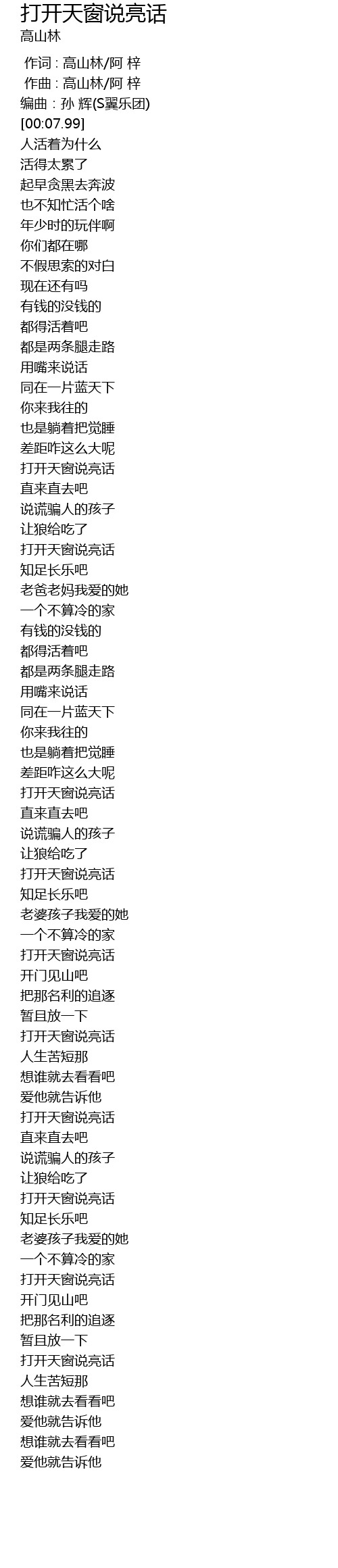 | [03:43.89] | dǎ kāi tiān chuāng shuō liàng huà |