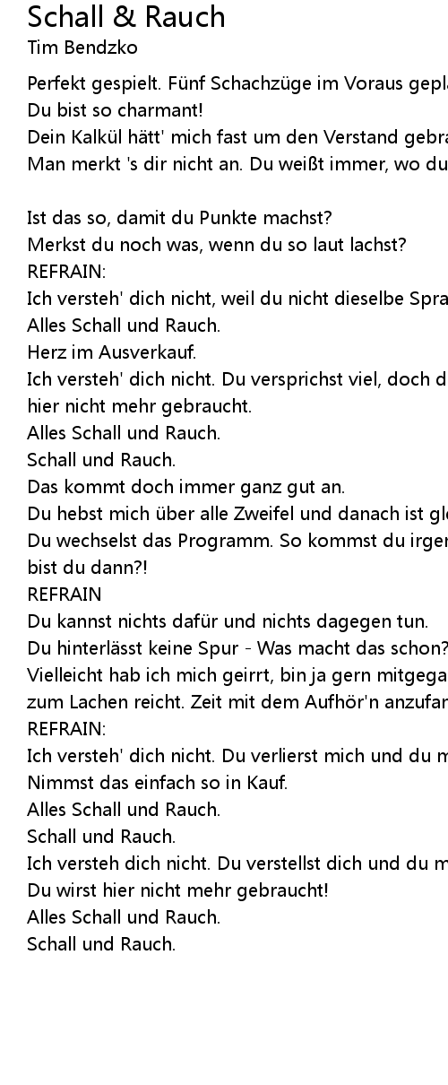 | Vielleicht hab ich mich geirrt, bin ja gern mitgegangen. Wei nicht mal, ob das zum Lachen reicht. Zeit mit dem Aufh r' n anzufangen. | |
