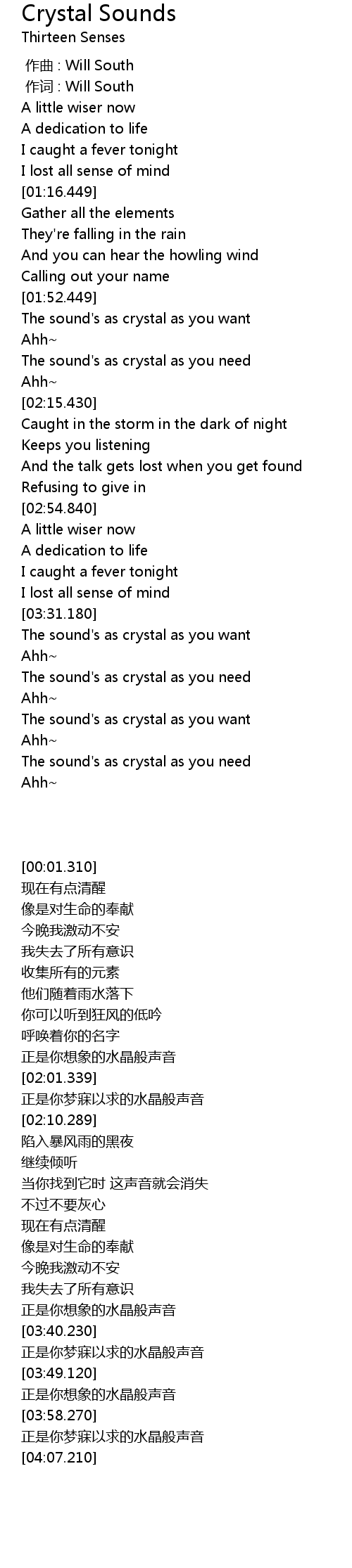 | [00:01.00] | zuò cí : Will South |