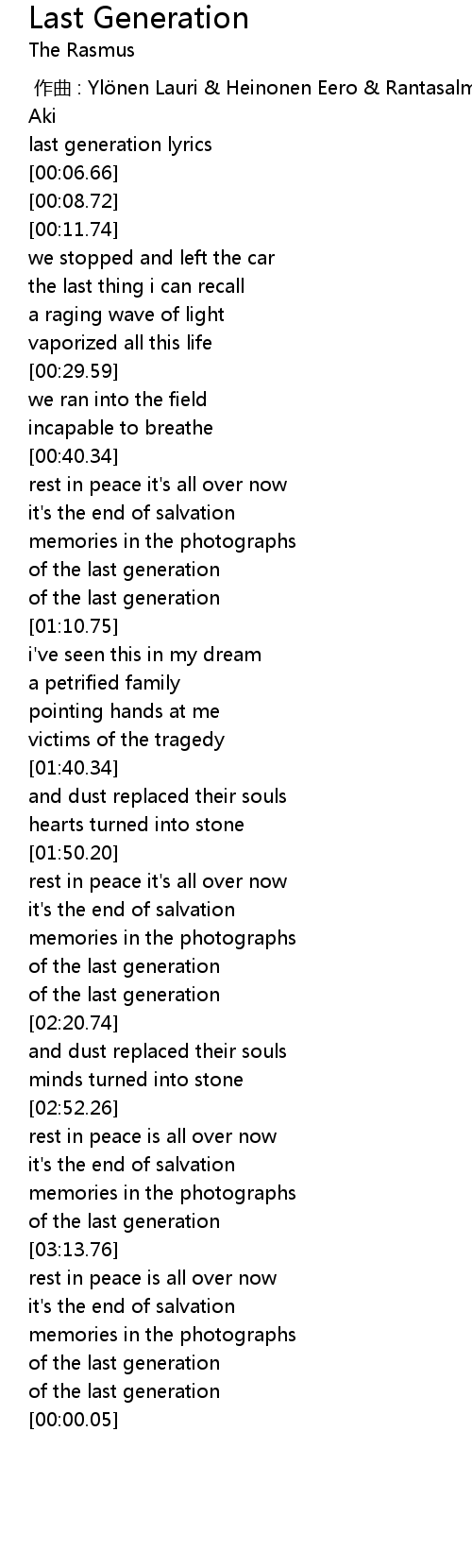 | [00:00.00] | zuo qu : Yl nen Lauri Heinonen Eero Rantasalmi Pauli Hakala Aki |